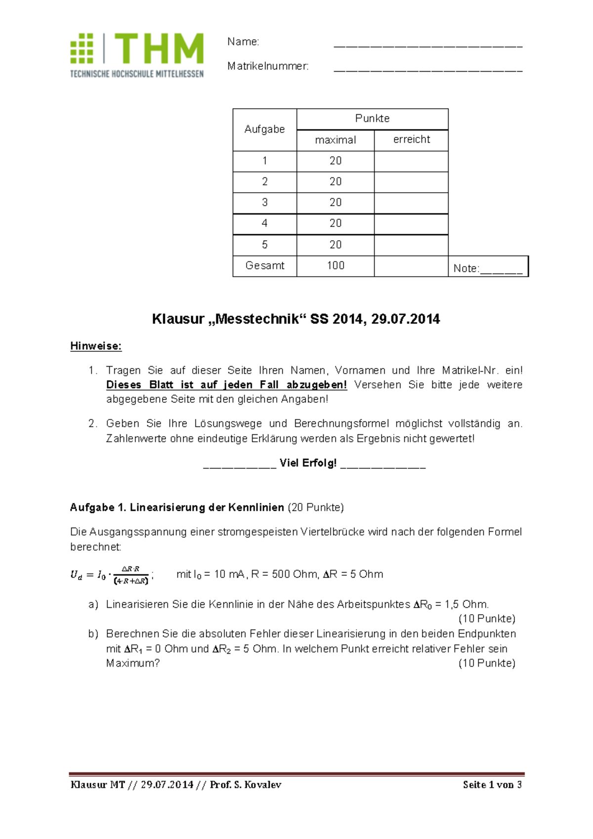 Klausur 29 Juli Sommersemester 2014 Messtechnik Thm Studocu