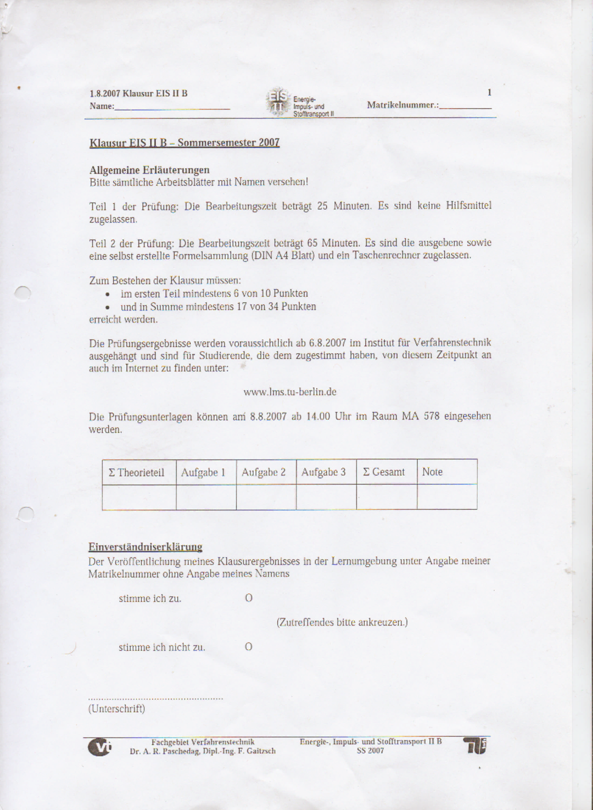 Klausur 1 August 2007 Aufgaben 0331 L 040 Tu Berlin Studocu